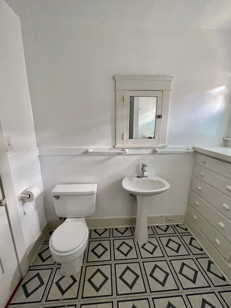 The full bath is adorned with charming built-in storage, a graceful pedestal sink, and a convenient tub-shower combination.