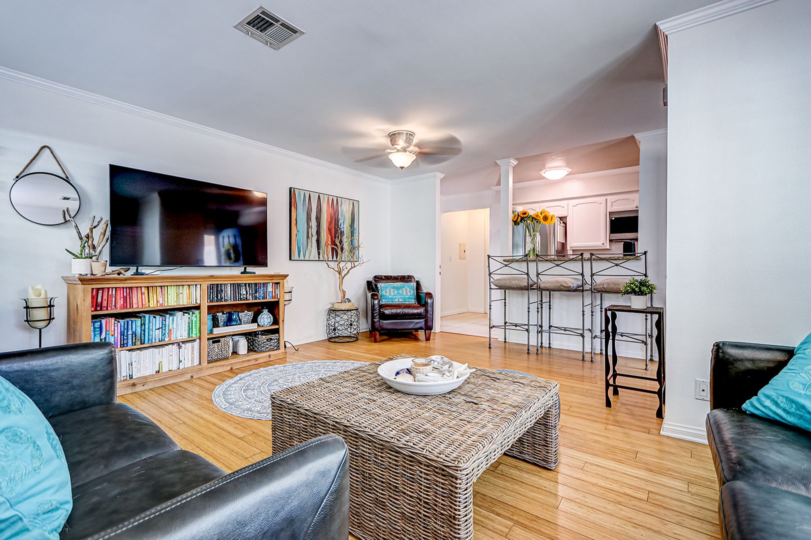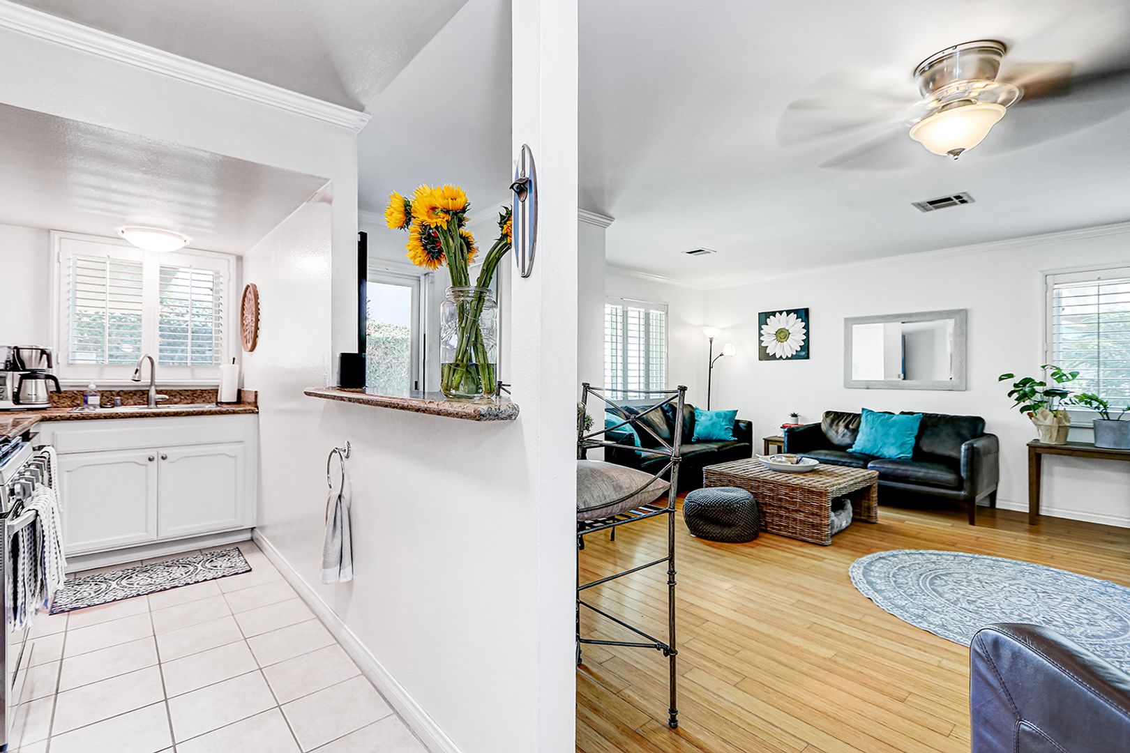 The home offers a more modern feel. Inside, enjoy bamboo wood flooring, a spacious living/dining area, and an open, remodeled kitchen with granite countertops, breakfast bar, and stainless steel appliances. Upstairs features two large bedrooms with no shared walls, mirrored closets, ceiling fans, and a nice full bath. (Blue bedroom will be repainted to match other bedroom).