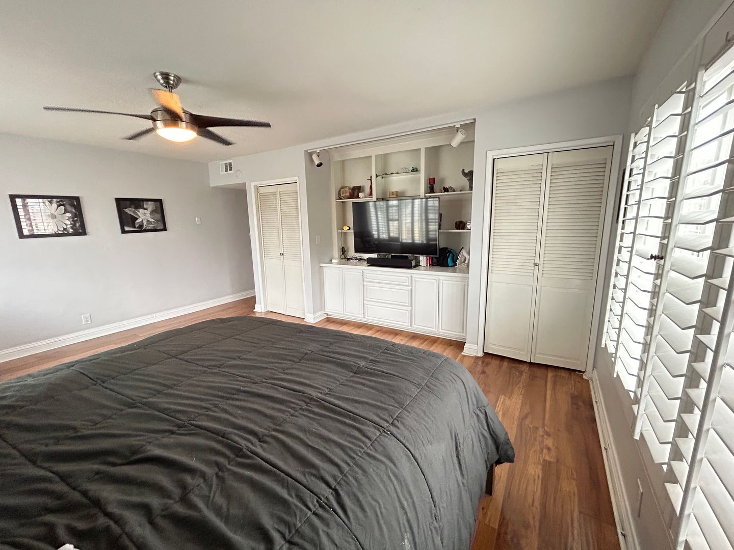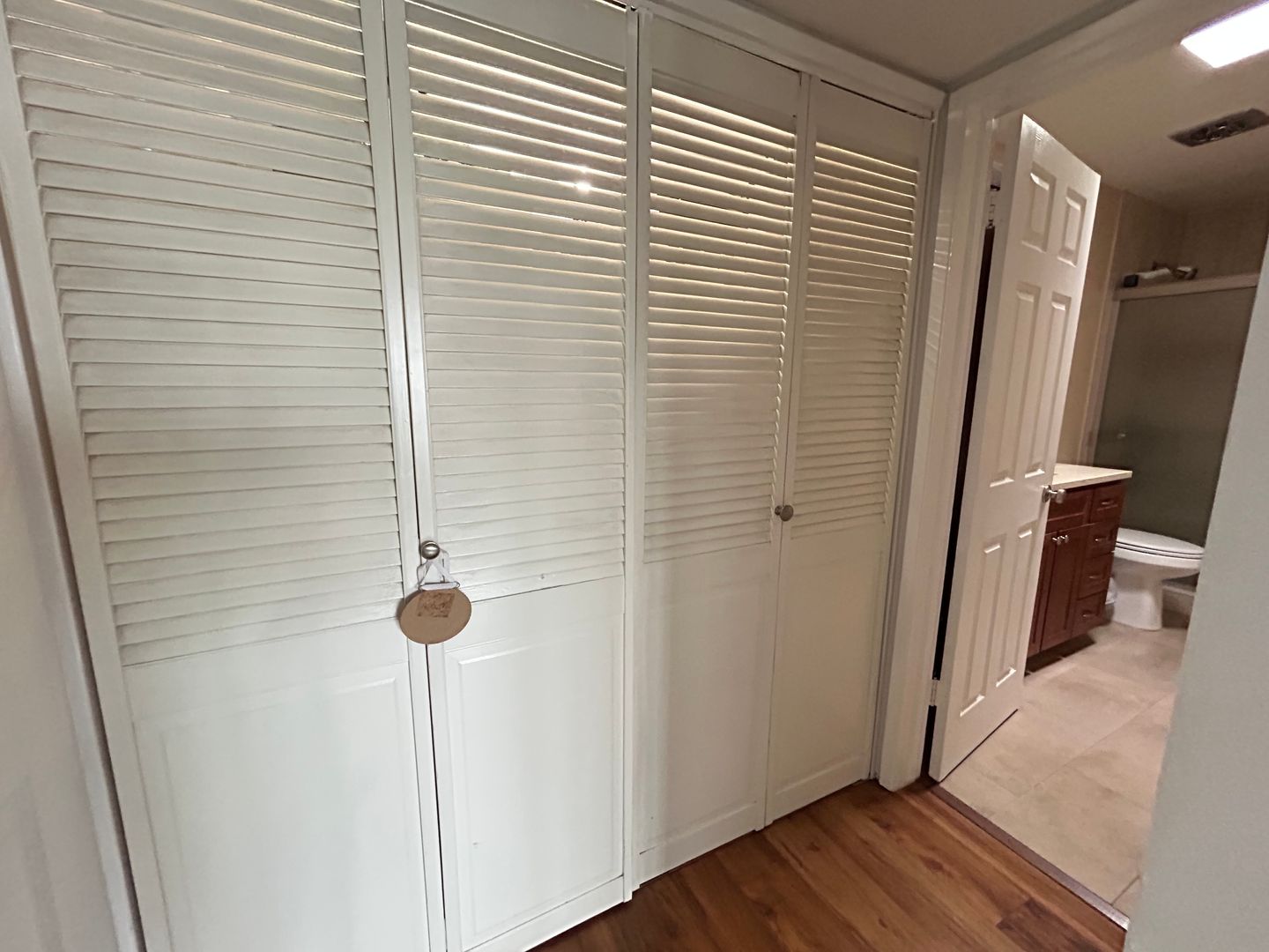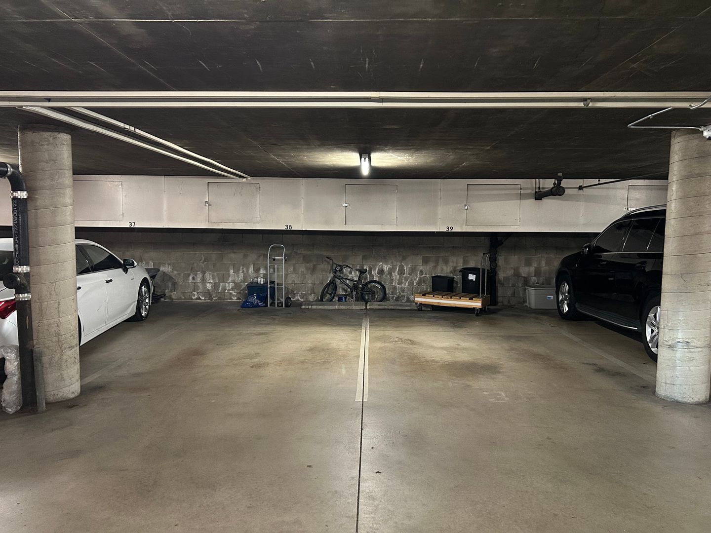 Spacious primary bedroom offers built-in cabinetry, double closets, and a private bath with stone countertops and tiled standing shower. Large closet off the bathroom offers space for linens and extras. Second bedroom features an extra-large mirrored closet and faux one-inch blinds. Guest bathroom includes beautiful tile work, double-sink vanity, and shower/tub combo. Close elevator access, convenient onsite laundry, and two assigned side-by-side parking spaces (#38 and #39) with storage cabinets included (to the right and left of #38). Extra storage is located right outside the condo’s front door as well.