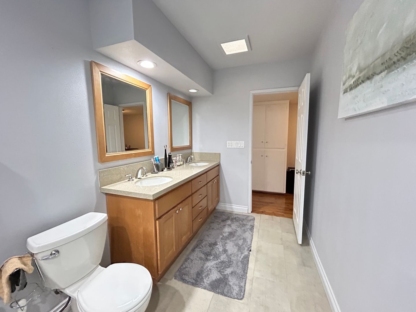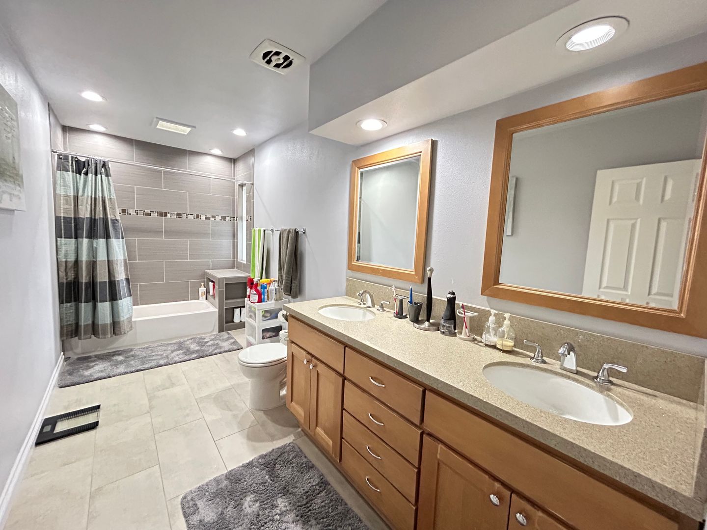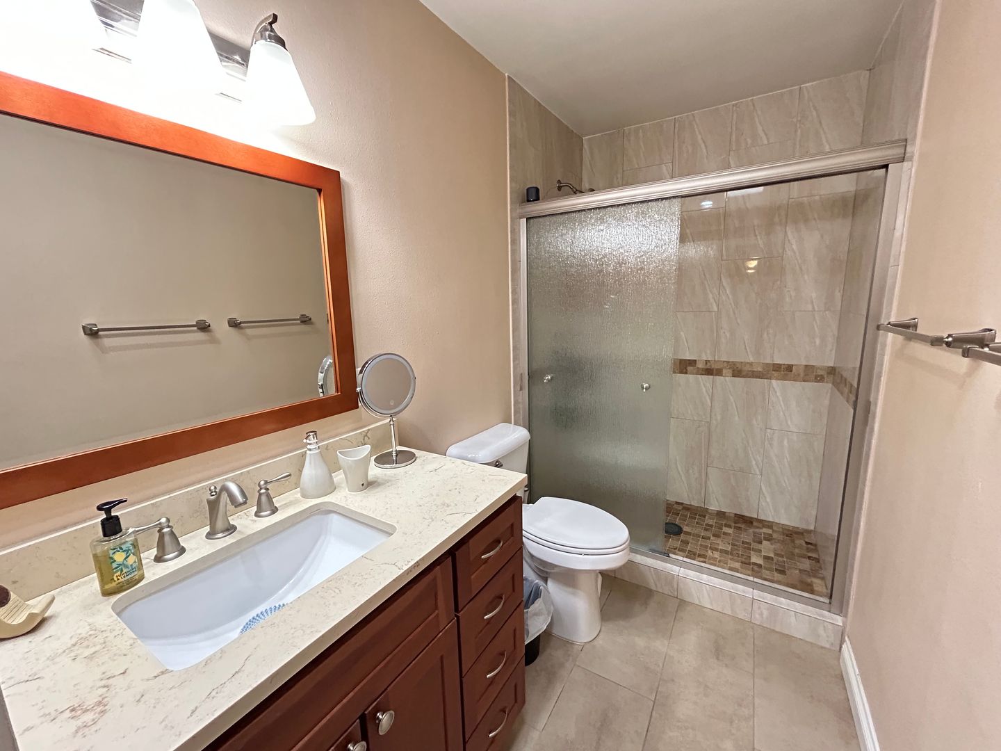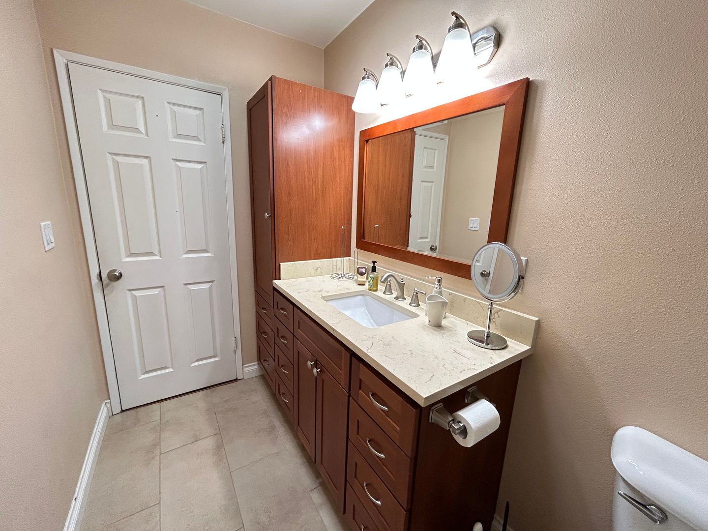 Spacious primary bedroom offers built-in cabinetry, double closets, and a private bath with stone countertops and tiled standing shower. Large closet off the bathroom offers space for linens and extras. Second bedroom features an extra-large mirrored closet and faux one-inch blinds. Guest bathroom includes beautiful tile work, double-sink vanity, and shower/tub combo. Close elevator access, convenient onsite laundry, and two assigned side-by-side parking spaces (#38 and #39) with storage cabinets included (to the right and left of #38). Extra storage is located right outside the condo’s front door as well.