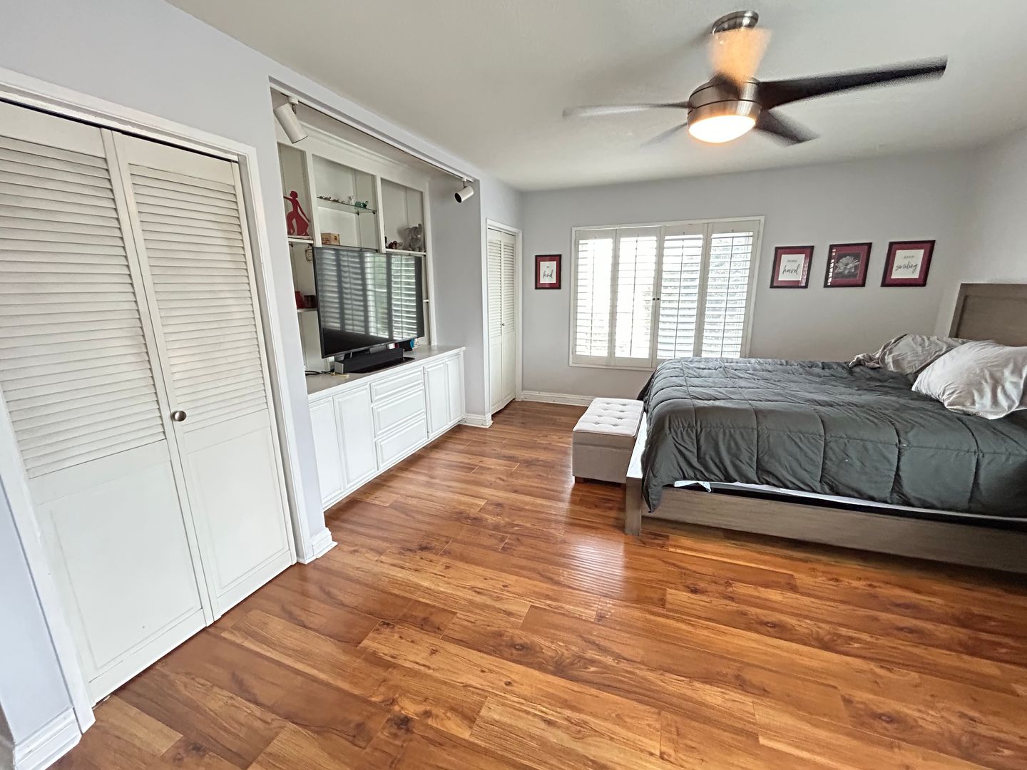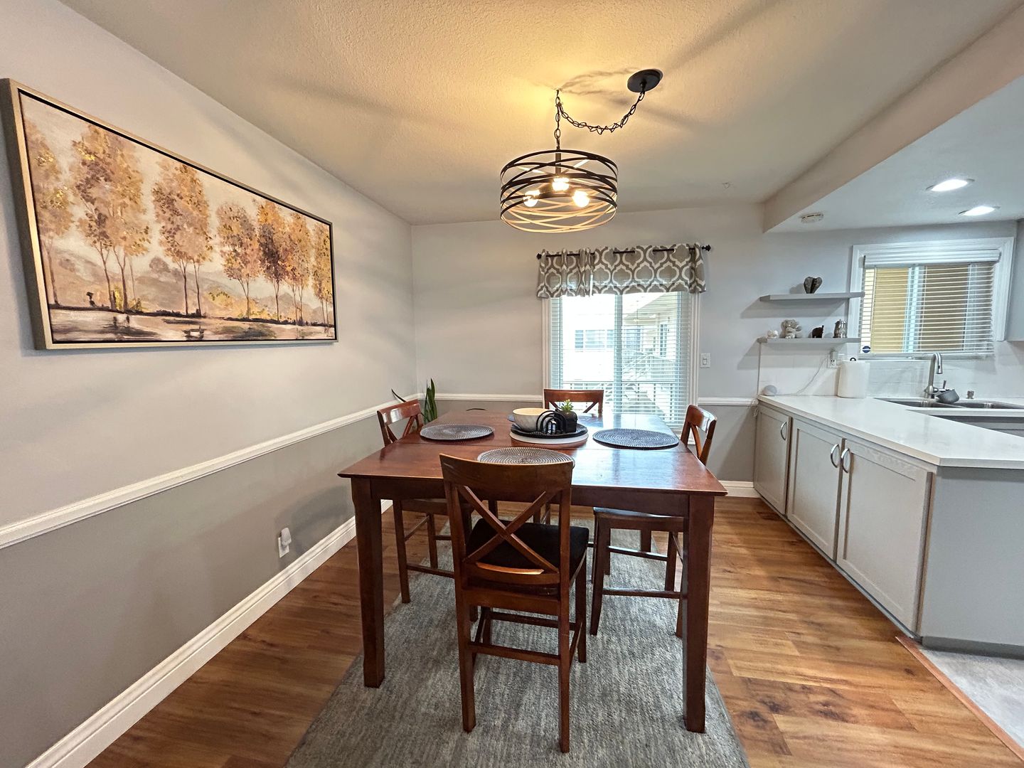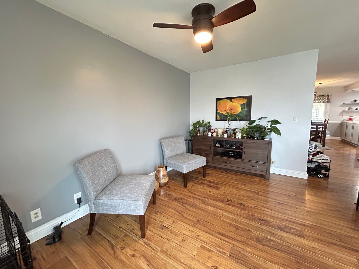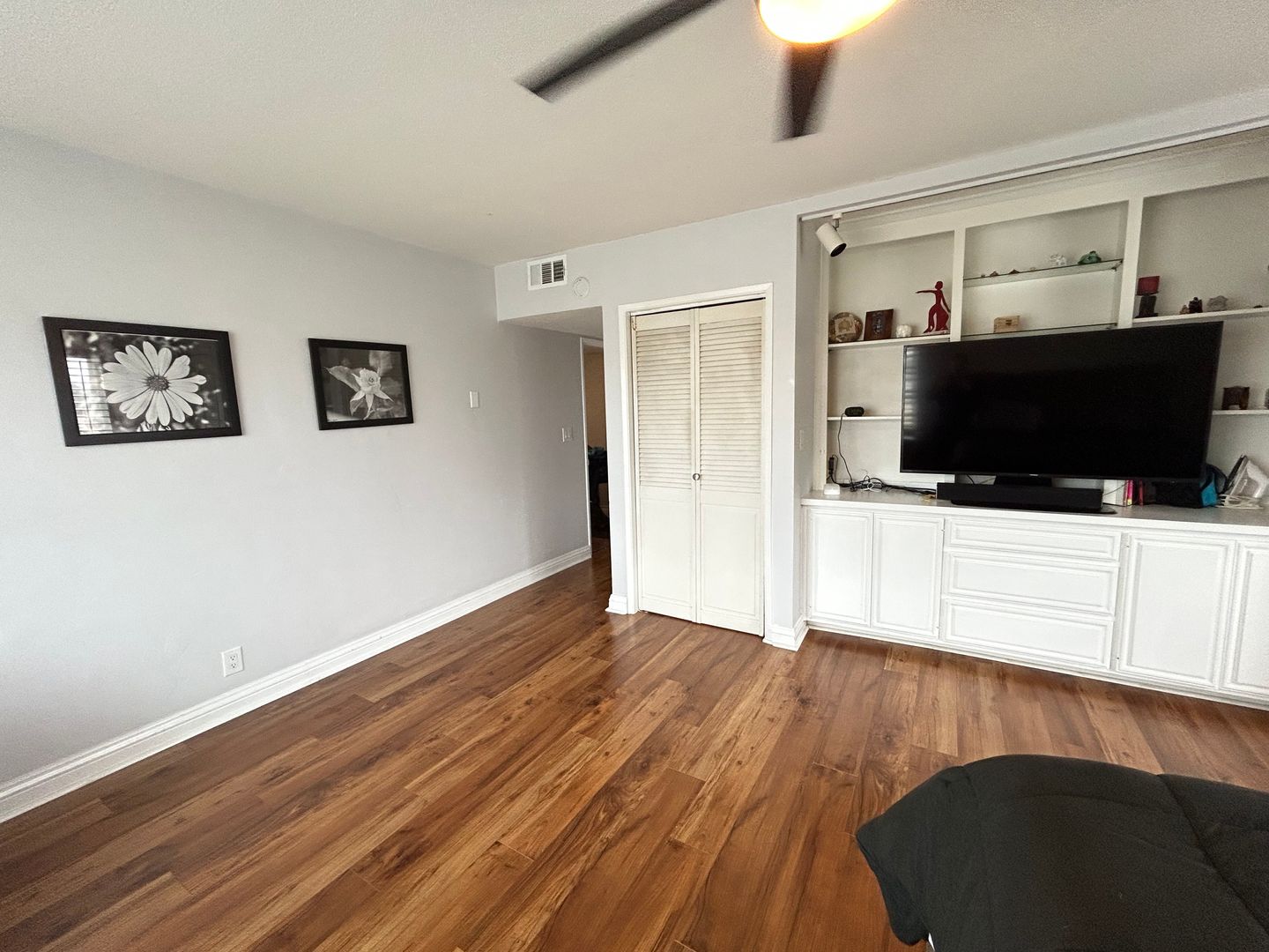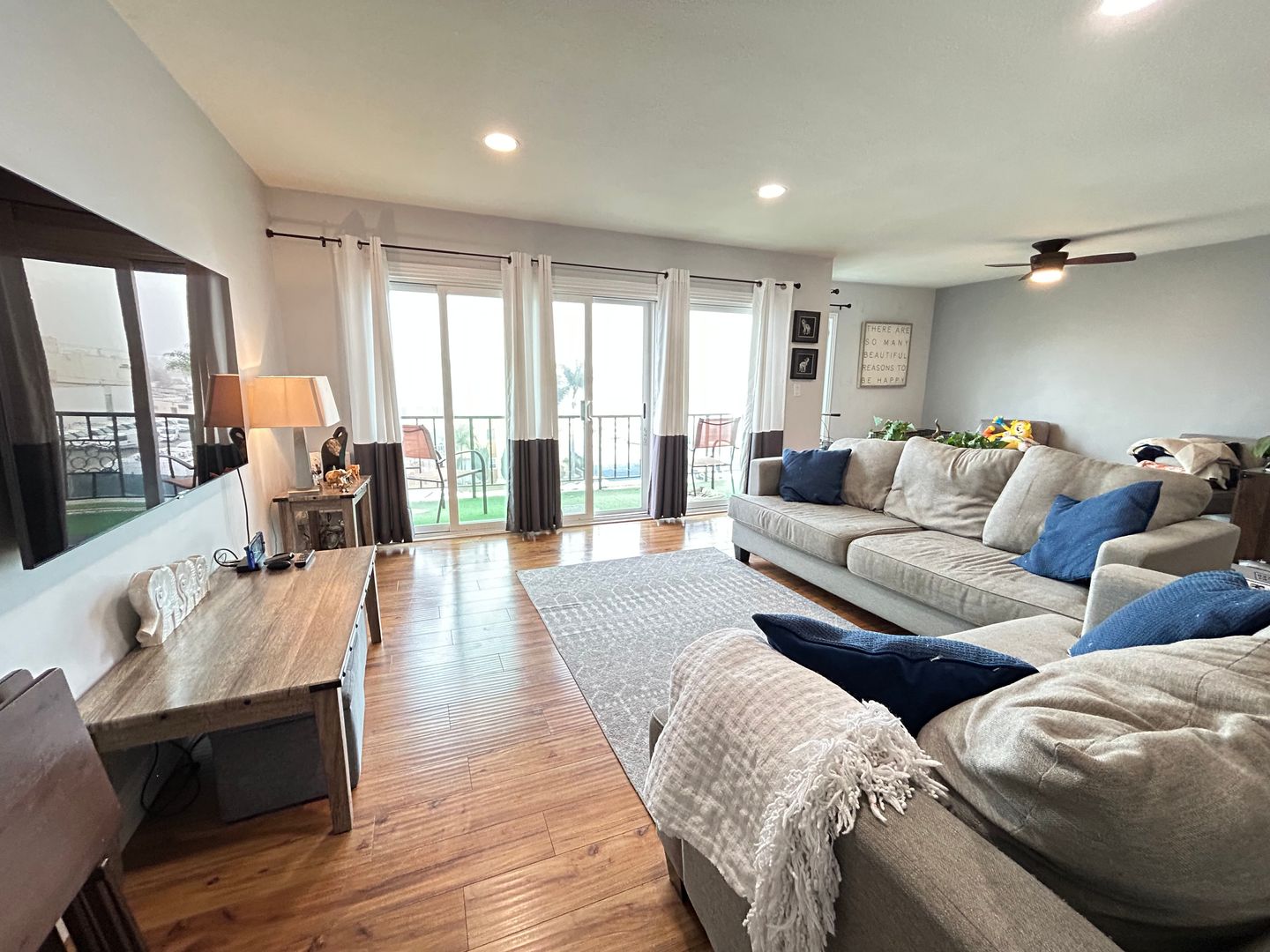 Desirable and spacious 2-bedroom, 2-bath condo featuring a wide open floor plan with gleaming wood-like floors, plantation shutters or window treatments, modern lighting, ceiling fans, and central A/C throughout. Enjoy a bright open kitchen with designer quartz countertops, beautiful white tilework, stainless steel appliances (stove/oven, microwave, dishwasher, refrigerator), and stylish gray cabinetry. Dining room space connects the kitchen and living room, and is decorated with modern lighting. Large living room includes excellent nature light and a bonus space ideal for an office desk or two, and also opens to a private balcony through sliding glass doors.