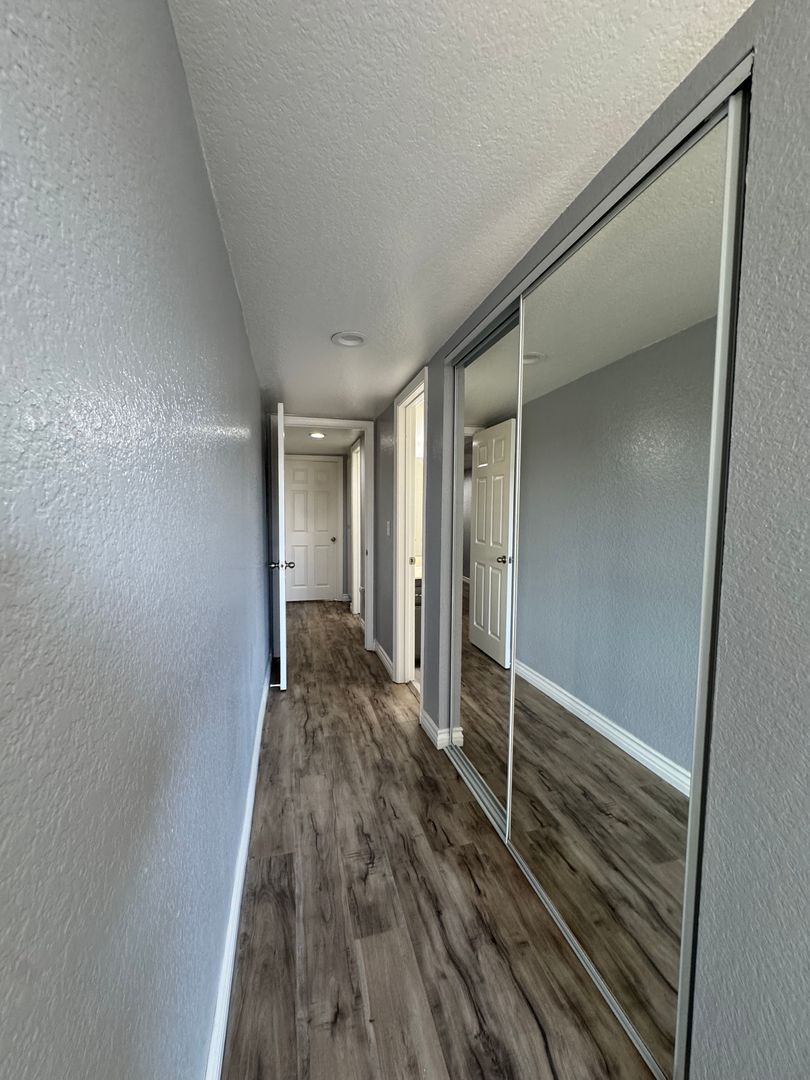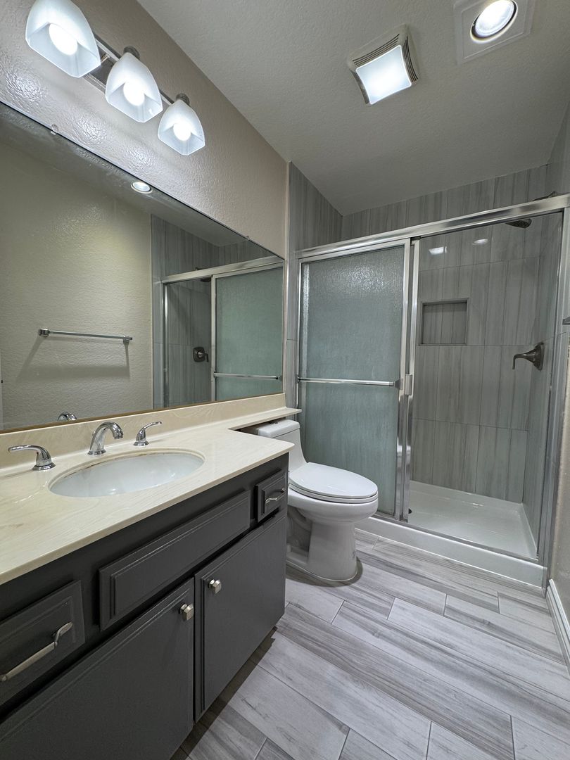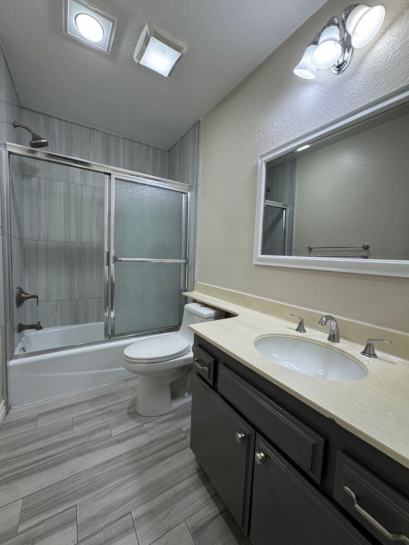 The bedrooms feature attractive laminate flooring and generous closet space with mirrored sliding doors. One bathroom includes a walk-in shower, while the second bathroom offers a full tub and shower, ideal for unwinding at the end of the day.