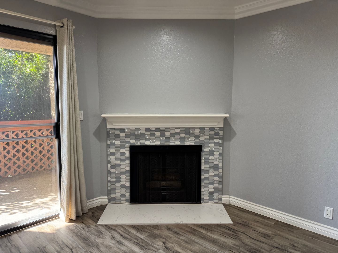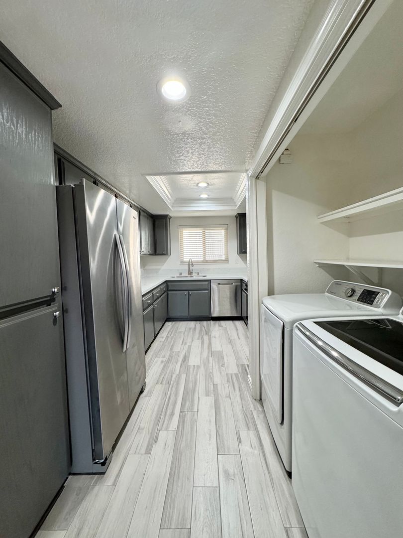 This bright and inviting condo features a well-lit living room with a cozy fireplace and a private balcony, perfect for relaxing with a good book. The kitchen offers ample cabinet space and comes equipped with a stainless steel refrigerator and dishwasher, along with a black stove. A laundry room conveniently located down the hallway includes a courtesy washer and dryer.
