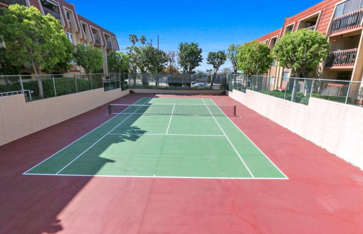 The unit includes central heating (no AC) and two assigned parking spaces (#67 & #68). Community amenities include a pool, jacuzzi, BBQ area, and tennis court. Trash service and HOA dues are included.