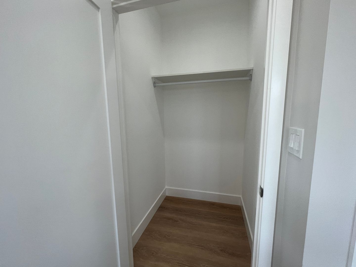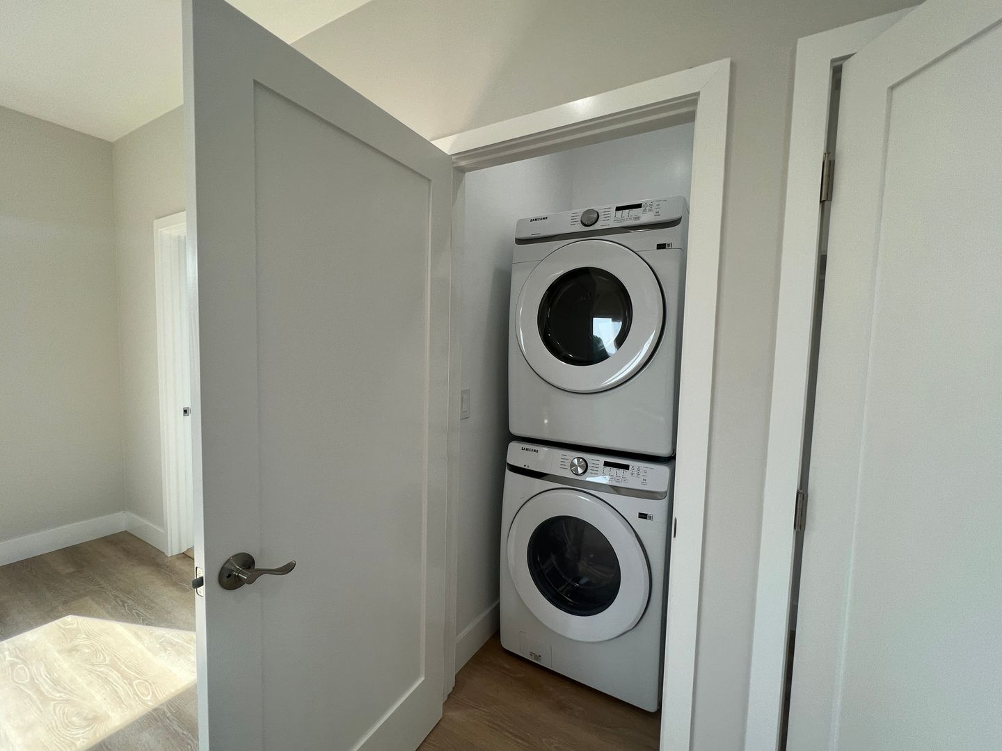 The modern kitchen cabinets provide ample storage space, ensuring that you have everything you need at your fingertips. And let's not forget the convenience of the high-end stackable washer and dryer, making laundry a breeze.