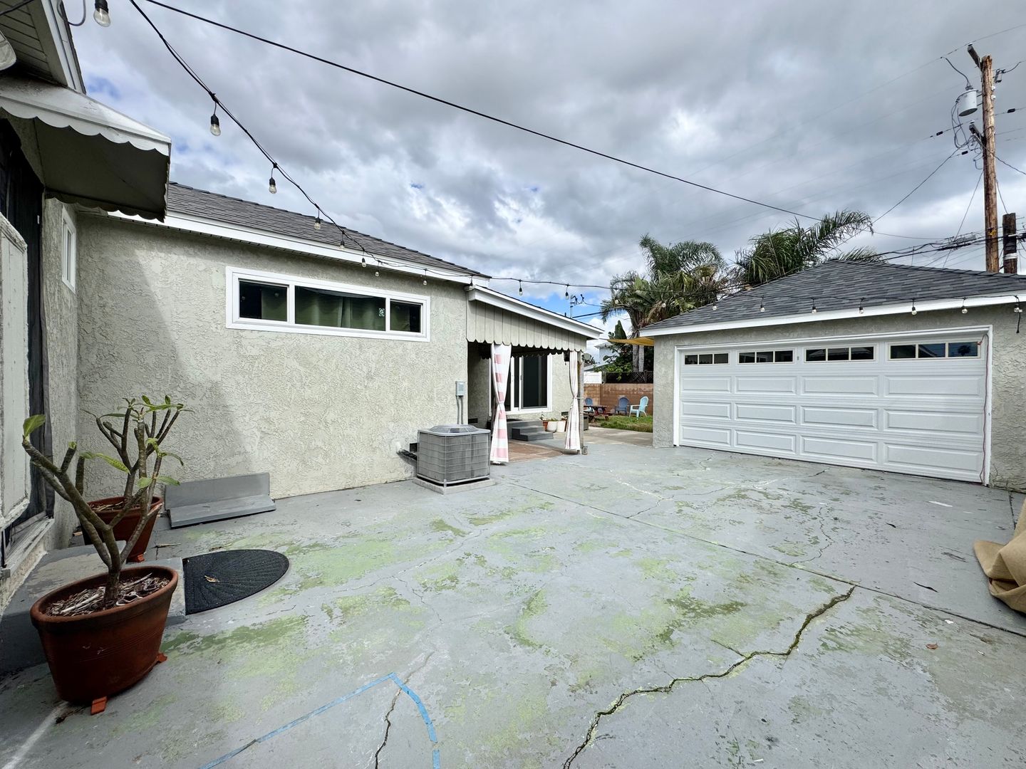 The home continues outdoors with a gated backyard, covered patio off the primary bedroom, firepit area ideal for entertaining, and an additional covered bonus space behind the two-car garage. A long driveway leads to a two-car garage with an automatic door.