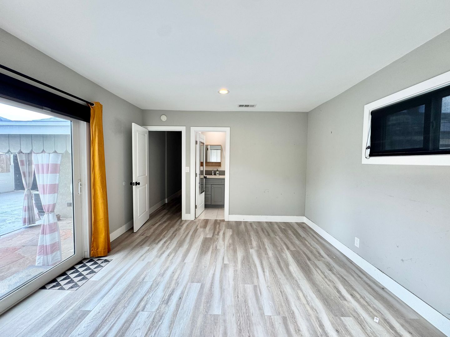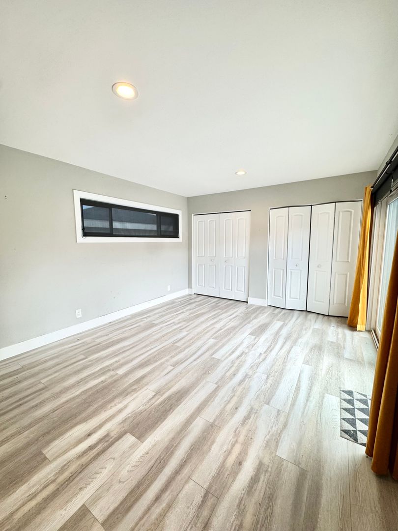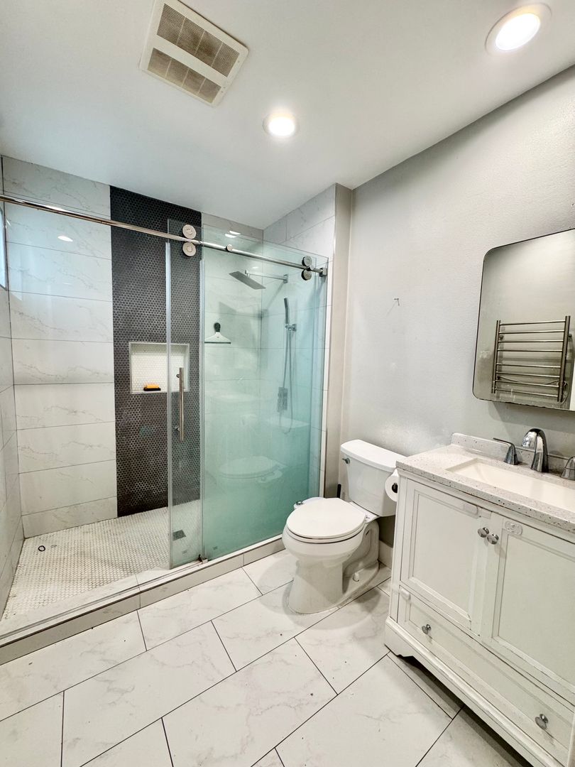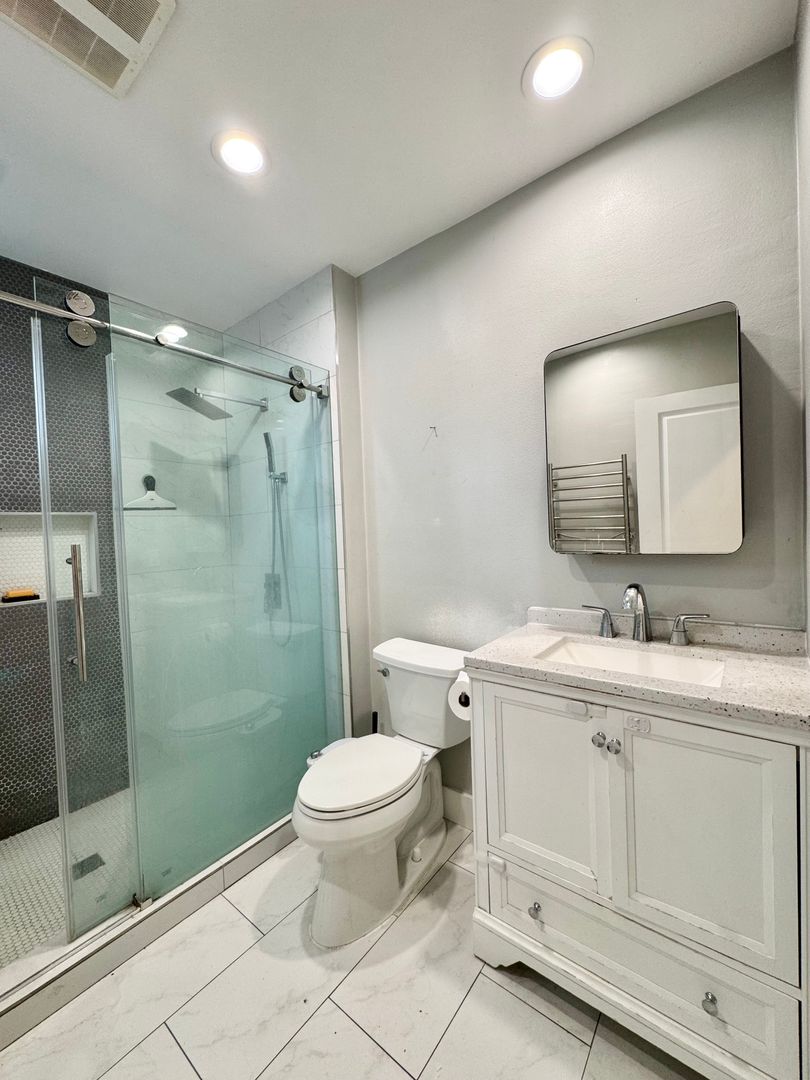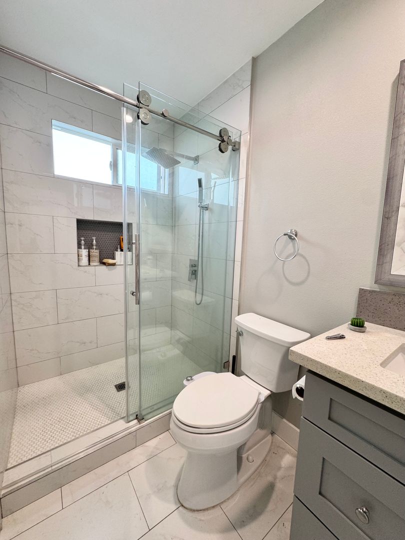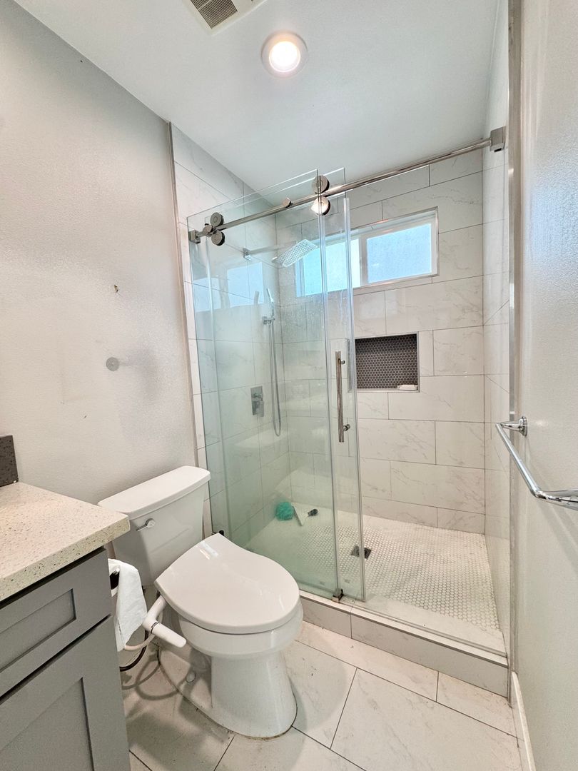 The large primary bedroom offers backyard access through a sliding glass door, two closets, and a private ensuite bathroom. The primary bathroom features a creatively tiled stand-up shower with frameless glass doors, a rainfall showerhead, a modern vanity, tiled flooring, and updated lighting. The second and third bedrooms are generously sized with ample closet space and great natural light.
