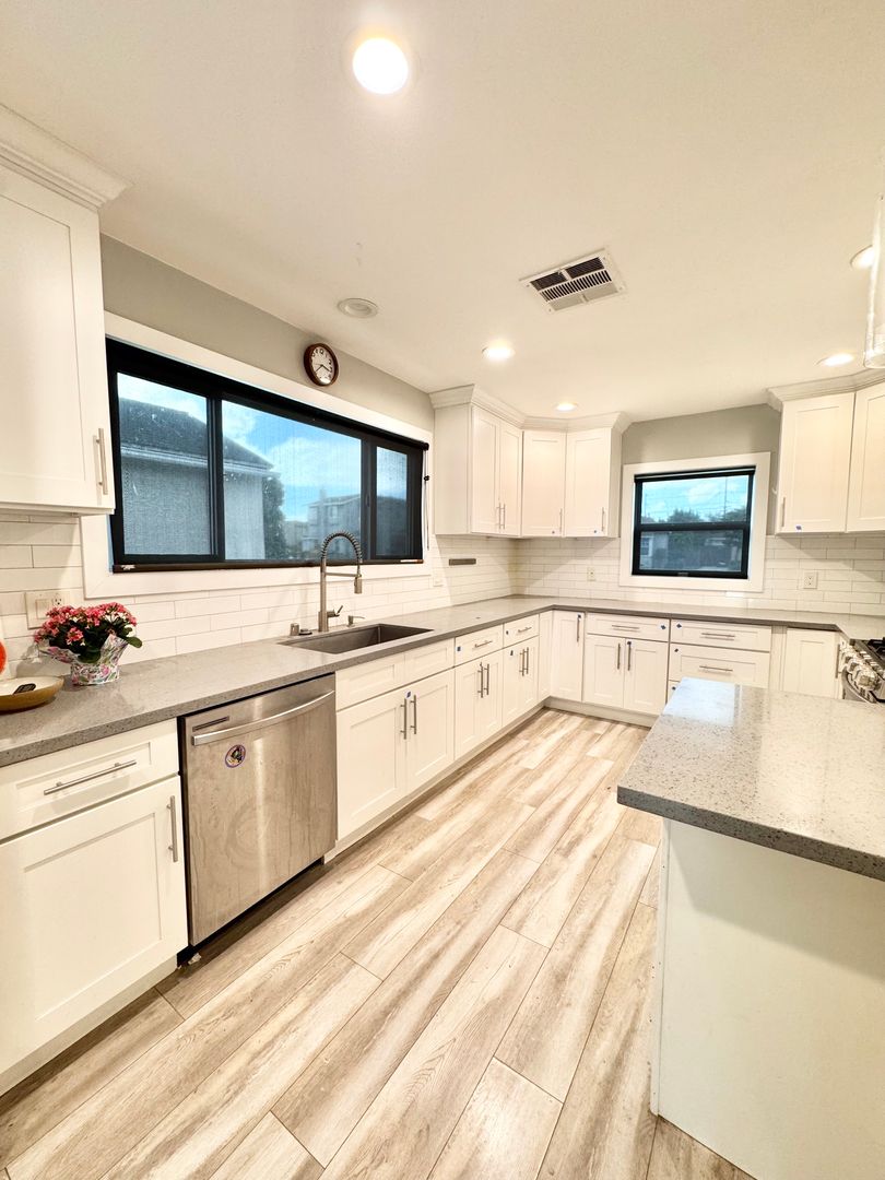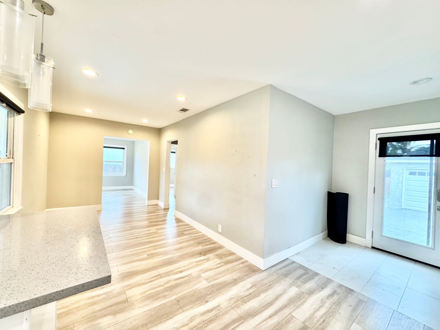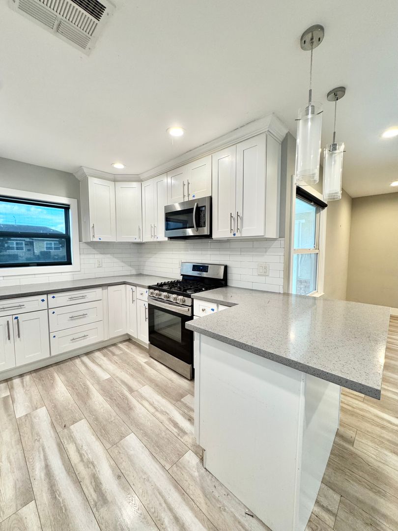 The remodeled kitchen boasts stone countertops, white shaker cabinets, stainless steel appliances, a breakfast bar with decorative pendant lighting, recessed lighting, and a laundry room conveniently located just off the kitchen. A dedicated dining area sits adjacent to the kitchen and overlooks the front yard.