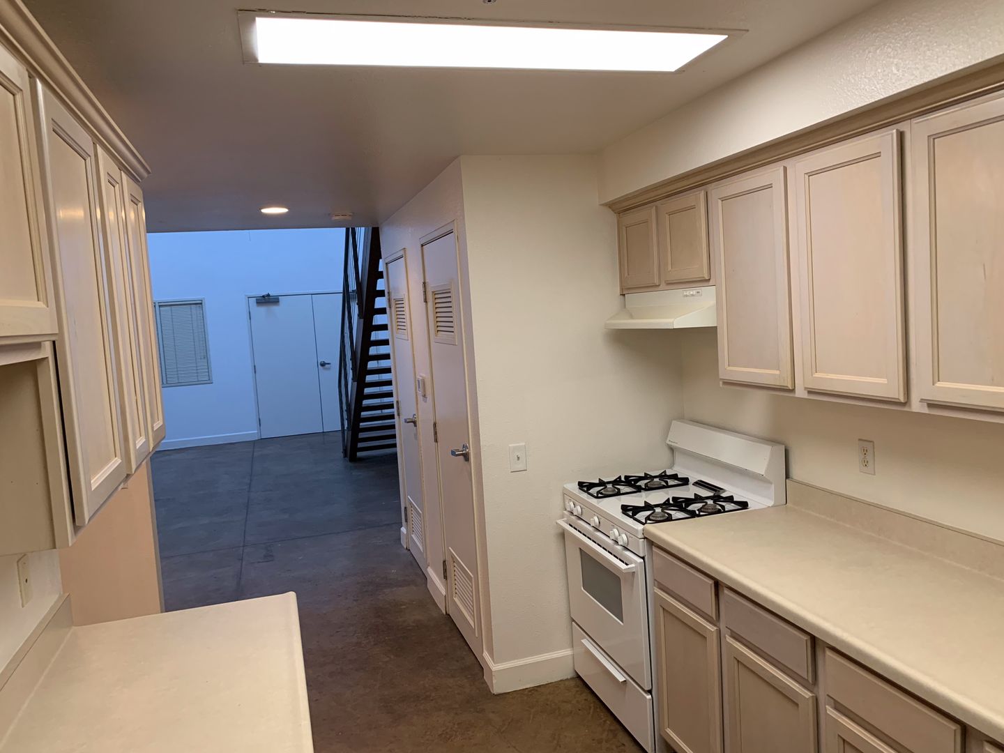 The loft features a spacious living area that flows into a staircase leading to the bedroom loft above. Skylights fill the home with natural light, creating a bright and uplifting atmosphere throughout. The kitchen includes a stove, refrigerator, and ample cabinet and storage space. The bathroom offers a shower, double sinks, and a convenient stackable washer and dryer.