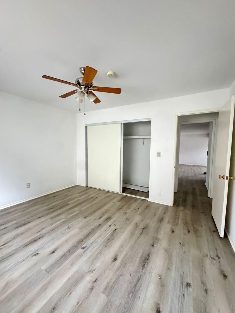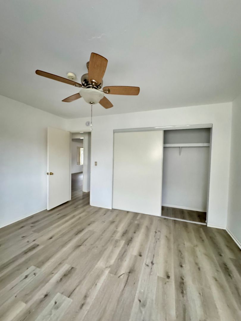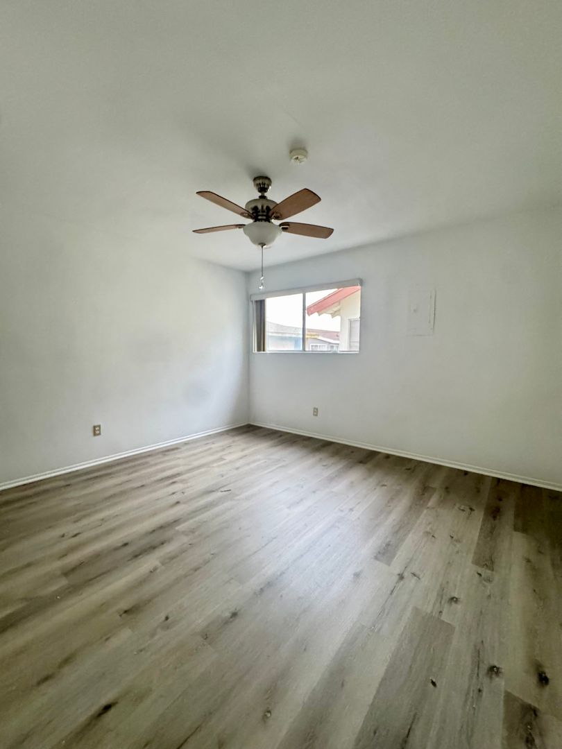Spacious and well-maintained upstairs back unit located in a 4-plex community. This apartment features two bedrooms, each with closets, and one full bathroom. Enjoy fresh new vinyl plank flooring throughout, along with ceiling fans for added comfort. The kitchen comes with tons of cabinet space and is equipped with a stove and refrigerator. Unit includes a one-car garage for convenient parking and storage. Owner pays for water and gardener service. On-site laundry available to tenants. Visit our website to schedule a showing today!