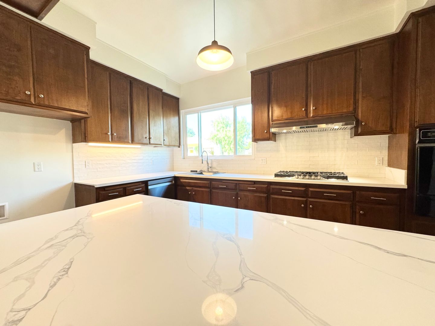 As you enter, you’re greeted by a welcoming foyer that opens into an extra-large living room featuring built-in cabinetry and neutral-toned vinyl plank flooring that flows throughout most of the home. The fireplace is decorative only and not for use. The formal dining room also includes built-ins and overlooks a beautifully well-manicured backyard, perfect for both everyday living and entertaining.